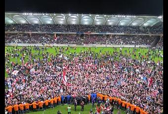 Trente trois ans que les supporters du Stade de Reims attendaient ça. 33 ans à lutter chaque week-end dans les joutes de Division 2 après la descente en 1979, puis un peu plus tard de sombrer jusqu’en Division d’Honneur, après une liquidation judiciaire en mai 1992 (20 ans jour pour jour avant cette remontée). Il fallut ensuite remonter les niveaux un à un, passer par la Nationale 3, le CFA, le National puis à nouveau la Ligue 2 avant de retrouver la lumière de la Ligue 1. Pendant cette période, les trophées ont même dû être vendus pour pouvoir boucher un peu les trous (Alain Afflelou les avait achetés et les a ensuite redonnés au club pour un franc symbolique). L’arrivée de Christophe Chenut à la présidence donna un nouveau souffle symbolisé par la série de 51 matches sans défaite !