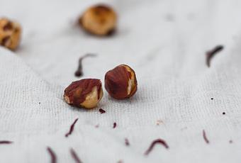 250g de mascarpone, 80g de sucre, 2 oeufs, 100g de chocolat noir, un peu de lait, pignons de pin grillés, noisettes concassées et grillées, perles craquantes au chocolat noir.