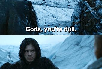 Je sais que Ned Stark est son père (…OU L’EST-IL? DOUM DOUM DOUMMM) mais ce n’est pas une raison pour être con et chiant. Même si Ygritte et le beau paysage égaient ses scènes, je ne peux réfréner mon agacement à la vue de sa bête tête. Et dans mon vocabulaire, il existe deux sortes de bête tête: a) celle qui est tellement parfaite que j’ai envie de l’insulter et b) celle qui crie tellement abruti que j’ai envie de la gifler. Littlefinger a une bête tête mais Jon a une bête tête, si vous voyez ce que je veux dire.