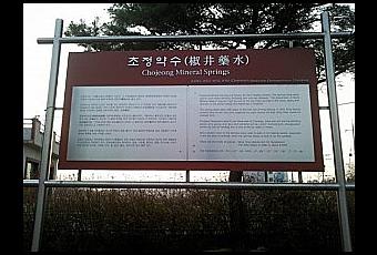 Selon d'anciens livres coréens : Dong guk yeo ji seng ram (동국여지승람) et Jo sun wang jo sil lok (조선왕조실록), le grand roi Sejong a été guéri de sa maladie de l'oeil en restant à Cho-jung, le roi Sejong y a aussi été guéri d'une maladie de la peau. Cette eau jaillit de la roche calcaire à 100 mètres sous terre et elle est si abondante qu'elle se vend beaucoup, aussi bien l'intérieur de la Corée qu'à l'étranger. Ces jours-ci, non seulement les entreprises de boissons rafraîchissantes, mais aussi des bains publics d'eau de source, à peu prés 30 restaurants et des usines de Soju utilisent l'eau minérale de Cho-jung. A cause de ceci, l'eau souterraine se tarit et on ne peut pas utiliser l'eau pour un usage agricole. Donc, les habitants de la région ont formé une association de défense pour conserver l'eau minérale de Cho-jung.