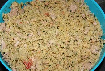 Dans le SALADIER POP'S 2,5l mettez la semoule puis le concombre haché ainsi que les tomates , ajoutez les autres ingrédients mélangez bien à l'aide de la spatule fermez le saladier et laissez gonffler 3h au réfrigérateur .