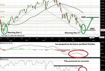 Vendredi soir le MATIF a terminé beaucoup plus bas que le cours de clôture de 17h30. Comme vous pouvez le constater sur le graphique c'est près de 30 points en dessous des 3008 que le niveau se situe (2977). Cependant l'étude technique permet de distinguer le début d'une structure de renversement appelée Morning Star avec une étoile en marteau inversé, il faudra cependant attendre la confirmation pour valider cette structure avec une ouverture au dessus de 2983 points et enchaîner sur une hausse significative. Pour valider la force du signal de renversement il serait souhaitable que le cours de clôture de Lundi se fixe sur les plus hauts de la séance. Il intéressant de noter que le rallye de début d'année avait été déclenché par cette même figure, il est donc normal de regarder cela de plus près. La conjoncture macroéconomique ne permet pas projeter une reprise de la tendance haussière, cependant nous pourrons tenter de jouer le rebond technique.