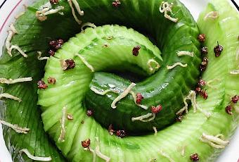 7. Mélangez cette huile avec un peu de vinaigre de riz et de sauce de soja claire. Enlevez l'eau de végétation sortie des concombres. Pliez les avec soin pour qu'ils forment en cercle. Mettez la sauce par dessus.