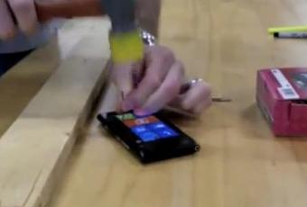 Comme dans n’importe quel test de durabilité, le Nokia Lumia 900 subit d’incroyables tortures, coups de marteaux, de clous… Il sert même lui-même de marteau à un moment donné. Le résultat ? Rien. Le téléphone n’a aucune trace et reste fonctionnel, ce qui prouve la solidité de l’écran Gorilla glass. Si vous voulez tenter la même chose chez vous, Nokia prévient qu’il n’est responsable de rien si votre téléphone ne survit pas à vos tortures.