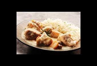 En fin de cuisson, diluer la farine dans un peu de bouillon. Ajouter dans la cocotte .Mettre la creme. Remettre la viande et laisser épaissir et cuire encore 10min tout en remuant.