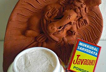 * le Javadhu est une poudre délicatement parfumée c'est un mélange d'herbes naturelles, avec des traces de bois de Santal , de bois de Rose etc..
