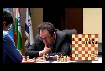 Ci-dessus, le challenger Boris Gelfand a l'affut du plan de gain avec les Blancs. En vain, nulle dans la 9e partie sur les 12 prévues - Photo © Chessbase
