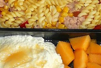 Etage du dessus : salade de pâtes - 2cs de pâtes cuites + 1 tomates coupée en dés + 3cs de maïs + 80g de thon, arrosé d'1cs de vinaigrette allégée
