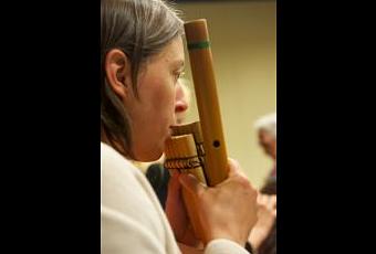 Une présentation de notre long cheminement, et du travail accumulé au fil des années, était faite par notre trésorière et "notre animateur préféré", quelques standards étaient ensuite au programme, et quelques-uns d’entre nous apportaient un soutien discret mais néanmoins efficace aux musiciennes de Bourg, qui présentaient là leur meilleur répertoire. Puis profitant des circonstances, par la présence de tous ces souffleurs de sikus, nous nous mettions en devoir de réciter sagement les gammes répétées dans la journée……Sauf que lors du premier acte : trous de mémoire, pannes, blancs, interludes…….Long moment de solitude, el "jefe" tenta l’impossible afin de colmater les brèches et sauver les apparences, redoublant d’ardeur, tout transpirant et le regard noir, au centre du cercle. A défaut de nous trouer la peau, il faillit bien se faire celle du malheureux bombo qu’il avait sous la main ! (Au visionnage de la vidéo, il s’avère que ça n’était pas totalement la "cata", et que le chef aurait pu taper encore plus fort…..Si si !)