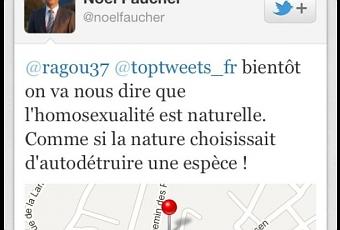 En effet, Noël Faucher, maire UMP de Noirmoutier et candidat suppléant aux législatives pour son parti a déclaré sur son compte Twitter, alors que personne ne lui demandait son avis sur cette question : « Bientôt, on va nous dire que l’homosexualité est naturelle. » Et d’ajouter avec cynisme : « Comme si la nature choisissait d’autodétruire une espèce. »