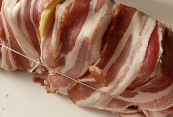 Dans un plat de la taille du rôti, légèrement huilé, disposer de très fines tranches de lard fumé (500g)perpendiculairement au rôti, puis poser le rôti froid en travers. Intercaler entre chaque tranche une lamelle de fromage fondant - par exemple des tranches de raclette sans croute. Refermer les lamelles de lard fumé, en recouvrir toute la viande et ficeler latéralement. Poivrer mais ne pas saler. Fromage et lard fumé le sont assez.