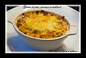 Bonjour, je vous propose un petit gratin rapide et facile à préparer... Idéal quand le temps manque pour faire la cuisine !!!! Un succès à ma table... Pour 4 petits gratins, il vous faut: 200 gr de pâtes 4 poireaux 200 gr de filets de cabillaud 20 cl de crème fraîche liquide 1 gousse d'ail gruyère râpé 1 cuillère à soupe d'huile d'olive 1 cuillère à café de curcuma 1 cuillère à café de zeste de citron 1 cuillère à café de gingembre en poudre 1 cuillère à café d'aneth ciselé 1 cuillère à café de graines de fenouil écrasées sel et piment d'Espelette Faîtes cuire les pâtes dans de l'eau bouillante salée. Une fois qu'elles sont al dente, égouttez-les et réservez. Lavez les poireaux et taillez-les en fines rondelles. Faîtes-les suer dans une poêle avec l'huile d'olive. Une fois que les poireaux ont fondus, ajoutez les herbes, épices et la gousse d'ail finement hachée. Laissez mijoter à feu doux. Taillez les filets de cabillaud en cubes et ajoutez-les aux poireaux. Assaisonnez de sel et piment d'Espelette et laissez mijoter 3 minutes avant de couper le feu. Répartissez les pâtes dans 4 plats à gratin. Répartissez également la préparation à base de poireaux et versez 5 cl de crème dans chaque plats. Parsemez de gruyère râpé et enfournez à 220° pendant 10 minutes maximum. Servez chaud... et bon appétit !!!