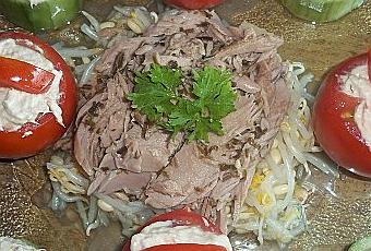 Disposez le soja au centre du plat et posez l'émincés de thon au romarin et persil sur le dessus.