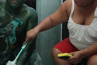 J’ai passé des heures dans la salle de bain en essayant de venir à bout du maquillage, mais en vain. J’ai demandé de l’aide à ma petite copine. Le pire, c’est que la peinture ne semble pas vouloir partir, le produit est imprégné dans mon corps. Même en frottant avec du savon, c’est toujours vert…