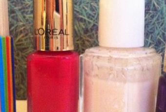 Munissez-vous de deux vernis des couleurs de votre choix. Pour ma part, j’ai choisi d’utiliser le vernis L’Oréal 211 obtenu dans My Little Box du mois d’avril, un joli rose fushia et un vernis Mavala Purple Sensation, un violet irisé ultra-brillant.