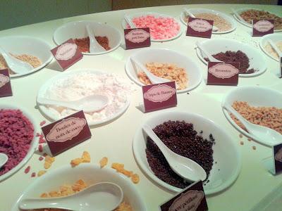 3. Vous choisissez les toppings (noix de coco, billes "thé citron", chips de banane, morceaux de caramel, poudre de brownie ou de Spéculoos, sucre pétillant... il y a le choix !)