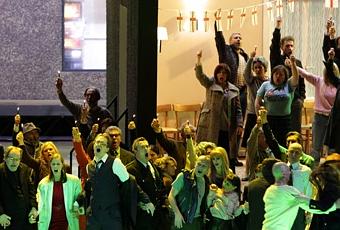Richard Jones est l'un des metteurs en scène en vogue aujourd'hui à l'opéra, on lui doit le Lohengrin et les Contes d'Hoffmann de Munich, le Macbeth de Lille et de nombreuses productions pour l'ENO. Sa mise en scène de Peter Grimes est débarrassée de tout "pittoresque", son village de pêcheurs anglais est tout sauf une reconstitution attentive du type de celle de Salzbourg à Pâques en 2005 dans la production de Sir Trevor Nunn. Des architectures froides, cubiques, quelques mouettes ou albatros accrochées aux toits rappellent que nous sommes au bord de la mer. Ce qui intéresse Jones, c'est d'abord l'opposition entre la singularité de Peter Grimes et les autres, les villageois qui trompent leur ennui et bavardent, pris entre les casinos automatiques et les slots machines, les soirées où l'on boit et danse, les petits malfrats, et ces regards permanents et peu charitables envers l'autre, lorsqu'il est différent: ces gens sont ceux de toujours et donc d'aujourd'hui, ceux que Brassens appelle "les brav's gens" dans "la mauvaise réputation"(cette chanson est d'ailleurs une véritable transposition de l'histoire de Peter Grimes). Et peu à peu on comprend que cette présence obsessionnelle de la collectivité, dès l'image initiale du procès (le chœur omniprésent à qui il impose des mouvements chorégraphiques - de Sarah Fahie d'une rare précision et d'un effet extraordinaire) est en fait une métaphore de la mer, dont on est une victime potentielle, et à qui l'on échappe pas, d'où les mouvements ondulatoires du décor, du chœur, des gens qui fluent et refluent et cette mer absente du décor est en fait présente sans cesse et finit par engloutir le protagoniste rejeté par les gens.