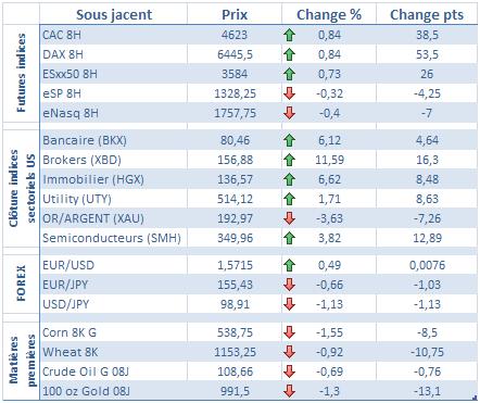 Forte hausse des marchés hier. La FED à baisser ses taux de 75 points de bas contre 100 points attendus. La réaction initiale fut baissière mais le marché à relativiser et le SP500 à fait sa plus forte hausse en 5 ans ! Le dollar à reprit du poil de la bête alors que les intervenants anticipaient depuis Lundi une baisse de 100 pts de base du FED fund, un léger repricing à ramener la partite euro/dollar sur 1.5612, ce matin la hausse à repris vers 1.5730. Le baril après avoir retouché son record historique à 111.8 corrige un peu ce matin. L'once d'or continue elle aussi sa correction et perd 4% en 2 jours.