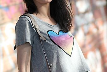 Le retour de la pluie ! Bon, allez, ce qui est bien c’est que je peux vous montrer sans complexe une tenue shootée il y a quelques jours, que j’aurais pu difficilement vous faire aimer la semaine dernière, avec 30 °C. Je crois que ce tee est définitivement l’un de mes préférés, court mais pas trop et surtout un motif rainbow adorable. Un look pastel, sur fond gris !