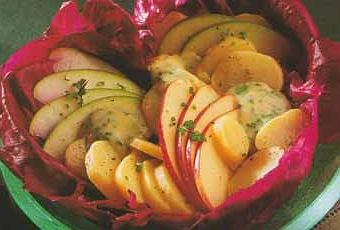 Ingrédients : 2 bouquets de trévise, 750 g de rattes, 2 granny-smith et 1 pomme rouge, 1 citron, 1 poignée de cerfeuil, , 25 cl de vin blanc, 1 jaune d’œuf, 1 cuillerée à soupe de moutarde, 15 cl d’huile d’arachide, 10 cl de crème fraîche liquide, sel, poivre.