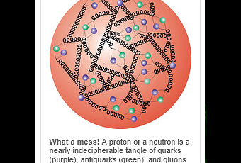 Mais reprenons !Dans un noyau il existe deux sortes de nucléons , proton et neutron .Dans chacun de ces deux types de nucléon les 3 quarks d'un nucléon génèrent un champ de gluons( particules médiatrices de l’interaction forte entre les quarks) d’autant plus intense que des paires fugaces de quarks-antiquarks apparaissent et disparaissent…… Et pour isoler ce qui est quark et ce qui est gluon ce n’est pas facile….On a ainsi découvert que la « marmaille » de gluons entourant les quarks de « base ou de valence » les faisait apparaître comme plus lourds qu’ils ne le sont en réalité. ……Pourquoi me demandez-vous …SI VOUS NE M’AVEZ PAS LU DANS « LA PHYSIQUE DE L HOROZON« , il y a quatre ans ???? ! C’est simple…contrairement aux photons, les gluons ont une attractivité « colorée » diverse (8) et se répondent en une sorte continue d’échos les uns avec les autres !!!! Regardez un peu ce fouillis dans la photo schématique de l’article de ADRIAN CHO !