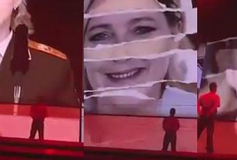 “Une vidéo diffusée sur un écran géant lors d’un concert de Madonna, tournée le 31 mai à Tel Aviv (Israël) provoque la stupeur ce vendredi. Dans cet extrait (l’interlude de la chanson «Nobody Knows Me») du «MDNA World Tour», un montage photo dévoile des images de Marine Le Pen, une croix gammée dessinée sur le front. Suivent plusieurs autres photos de dirigeants politiques et religieux dont Hitler et le Pape Benoît XVI, et des extraits de combat. Des acrobates dansent sur des fils sur la scène, dont est absente la chanteuse américaine.