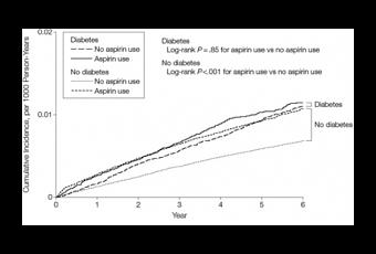 Mas pas d'augmentation du risque chez les patients diabétiques : Cette utilisation de l'aspirine associée à un risque accru de saignement majeur dans la plupart des sous-groupes évalués, ne l'est pas chez les patients diabétiques. Car si le diabète est associé, mais de façon indépendante à risque relatif accru de 36% d'épisodes hémorragiques majeurs, c'est tout à fait –encore une fois- indépendamment de l'utilisation d'aspirine. Cette étude montre donc, pour la première fois qu'un traitement par aspirine n'augmente que de manière non significative, le risque de saignement chez les personnes diabétiques. Des résultats qui confirment l'efficacité de l'aspirine sur ce groupe de patients. En conclusion, si, dans cette cohorte de patients à risque cardiovasculaire élevé, l'utilisation de l'aspirine est significativement associée à un risque accru d'hémorragie majeure, les patients diabétiques forment bien une population différente en termes de bénéfices attendus et de risques associés à la thérapie antiplaquettaire.