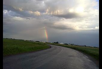 La pluie qui s’annonçait depuis quelques jours aux travers mes os douloureux est enfin tombée. Puis le soleil s’est vite montré le bout du nez nous faisant miroité dans un ciel à demi dégagé, les couleurs brillantes d’un premier arc-en-ciel.