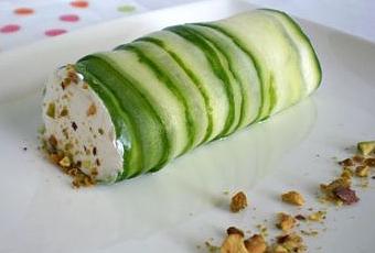 A l'aide du film, roulez les rubans de concombre autour du fromage en emprisonnant le surimi.