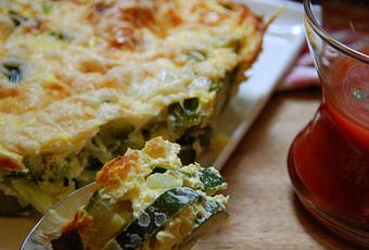 froid : versez un peu de sauce tomate chaude sur une tranche de flan de courgettes froid.