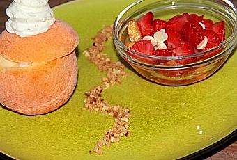 Orange givrée , chantilly vanille, salade de fraises et pêches marinées à la fleur d'oranger et au sirop de vanille avec pistoles de chocolant blanc (recette publiée précédemment ICI sans le basilic et avec des pêches)