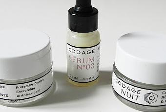 Codage est une marque de soins, dont la spécificité est de proposer un service de création de soins sur-mesure. Vous pouvez en effet effectuer en ligne un diagnostic de 23 questions qui déterminera en fonction des spécificités de votre peau, de votre hygiène de vie, de vos priorités et de votre type de peau les soins les plus adaptés à celle-ci. Vous pouvez ensuite personnaliser le packaging de votre soin sur-mesure en y apposant vos initiales. Les prix varient en fonction des composants sélectionnés grâce au diagnostic, mais ils sont de l'ordre de 30 à 80€ environ. Codage propose aussi deux crèmes, six sérums et un nettoyant.J'ai eu la chance de pouvoir tester trois de ces produits en format voyage.