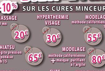 Plaque vibrante, Cure Minceur et Cure Thalasso avec produits de la mer Morte, Modelage (méthode indienne, californienne), Cellu M6, Radiofréquence, Cavitation, UV, Dépilation longue durée, Soins visage (Payot), Maquillage semi-permanent.