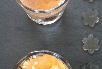 Dans la première verrine, c'est le melon en petits dés surmontés de fleurs de gelée de porto blanc et de graines de sésame...