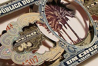 ... Rodrigo Torres a dû se balader un peu partout dans le monde avant d'entreprendre ses derniers travaux artistiques. Prenant un soupçon de dollar, découpant un bout de yen, assemblant le tout avec quelques autres devises étrangères sélectionnées par ses soins pour leurs qualités plastiques ou leur symbolique, il nous offre "Currency Collages", sa dernière série d'œuvres dans lesquelles il mélange devises et nationalités après avoir préalablement découpé finement tout ce qui l'intéresse pendant de très longues avec un X-Acto © TM. Une dentelle de devises superposées en couches fines comme un mille-feuilles que nous offre ce Brésilien talentueux et qui doit valoir son pesant de pesos. Ou sont-ce des Cruzeiros ou des Rands ou des Dinars ou des Dirhams ou des Kwanzas ou des Guilder ou des Drams ou des Manats ou des Pulas ou des Takas ou des Ngultrums, je ne sais plus. Oui, peut-être des Ngultrums, la monnaie du Bhoutan.