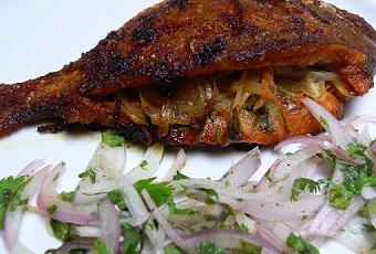 Stuffed fish Ingredients for four 4 black bream (I used silver pomfret) Peanut oil as required For the marinade ½ tbsp mild paprika pd 1 tsp chilli pd ¼ tsp turmeric pd 1 tbsp sugarcane vinegar (or any other milk vinegar) Salt For the filling 6 shallots, sliced Salt Juice of two limes ½ bunch of coriander leaves chopped Method: Silt the fish, from the back fin side on both sides of the central bone and empty the fish. Make three incisions on both sides of the fish and spread the marinade. Mix all the stuffing ingredients and keep aside half. Stuff the fish with the other half stuffing. Heat oil and shallow fry the fish till cooked on both sides. Serve with the remaining stuffing.