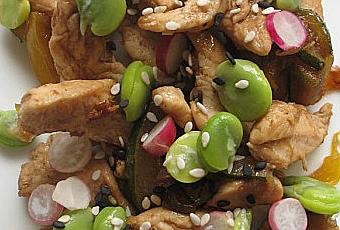 Pour 3 assiettes, il vous faut : 3 escalopes de poulet, 1 courgette, 1 poivron jaune, quelques fèves, quelques radis (du jardin pour moi), des graines de sésame noir et blanc, 2 cc de miel d'acacia, de la sauce soja, du vinaigre balsamique, sel et poivre.