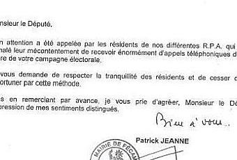 Lorsque Patrick Jeanne, maire de Fécamp ecrit à Daniel Fidelin (voir ci-dessus) en lui disant que sa campagne de phoning n'a pas respecté le reglement interieur des residences personnes âgées en