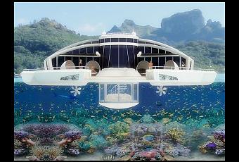 Cet hôtel pour 6 passagers a été envisagé comme une fusion d’un navire de croisière et d’une plate-forme sous-marine. L’engin pourra faire le tour des côtes paradisiaques et permettre à ses passagers de découvrir la vie marine et sous-marine sauvage.