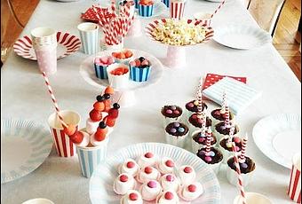 Toute la vaisselle, les pailles, les serviettes, les bougies, les moules et les décos de cupcakes viennent de chez le pingouin de l'espace et la guirlande est home-made. Photos Livsstil.