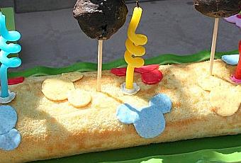 Pour l'anniversaire de ma filleule, fan de mickey, j'ai réalisé ce gâteau rapide pour les enfants, un roulé estampillé mickey accompagné de cakes pops minnie...