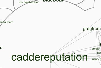 Le premier nuage a été nettoyé de tous les mots qui ne correspondent pas à des pseudonymes Twitter. Ainsi nous n’avons que les Twittos, leurs liens et leurs poids. J’ai limité les résultats à 35 pour que cela reste facilement accessible.