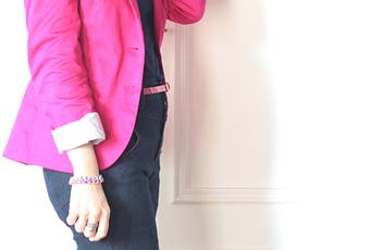 Blazer Stradivarius, jean Dolchana, sandales Toscania, ceinture H&M, rouge à lèvres Gemey (encre à lèvres SuperStay), bague Clara Jasmine, collier Da Wanda, bracelet DIY (DIY sur le blog Honestly WTF)