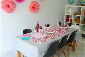 Samedi était le jour J pour la fête de presque-anniversaire de PetiteFleur avec 7 de ses copains-copines à la maison. J'avais fait quelques préparatifs très rose pour ce grand jour et le matin, nous nous sommes activées entre filles pour faire une déco à tomber, et le résultat fut trop trop beau en toute modestie!