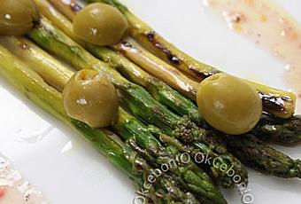 Quand les asperges sont bien grillées et cuites, disposer dans un plat de service et arroser de sauce. Laisser reposer quelques minutes.