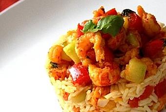 Détailler l'ail en petits morceaux et le faire revenir dans un tout petit peu d'huile. Ajouter les poivrons et les courgettes. Faire cuire à feu moyen en mélangeant pendant 2-3 minutes. Ajouter un tout petit peu d'eau et continuer à faire cuire pendant 10 minutes en remuant de temps en temps (bien vérifier qu'il y ait toujours assez de liquide pour que ça n'attache pas). Ajouter 1 cc de fond de volaille, la moitié du safran, le piment d'espelette et saler. Ajouter les ecrevisses et le basilic ciselé et cuire encore à feu doux pendant 5 minutes.