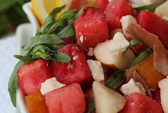 2)Disposez melon, poires, féta et estragon dans une assiette de service. Arrosez de miel, d'un peu de jus de citron et d'un bon filet d'huile d'olive. Poivrez et servez avec des chips de serrano.