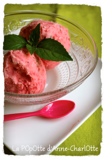 Ingrédients pour 750ml de glace : - 500g de fraises fraiches (attention, la qualité de la glace dépend du parfum des fraises !)- 300ml de crème fraiche entière- 100g de sucre fin - 1 citron jaune bio - 10 belles branches de basilic frais. La veille.1 ) Placer la cuve de la sorbetière dans le congélateur la veille.2 ) Rincer les fraises et le basilic. Equeuter les fraises et les placer dans un mixeur ou blender. Ajouter les feuilles de basilic, le jus de citron et le sucre. Mixer quelques secondes pour obtenir une texture avec quelques petits morceaux de fraise. Mélanger le coulis obtenu à la crème. Verser la préparation dans une boite hermétique et placer au frais.Le jour même.1 ) Brancher la sorbetière et y verser la crème aux fraises. Laisser tourner 25 minutes (plus ou moins en fonction de votre machine). Déguster aussitôt ou verser dans une boite à glace et placer au congélateur jusqu'à la dégustation.L'Astuce de la POpOtte : Remplacer les fraises par des framboises et le basilic par de la menthe !