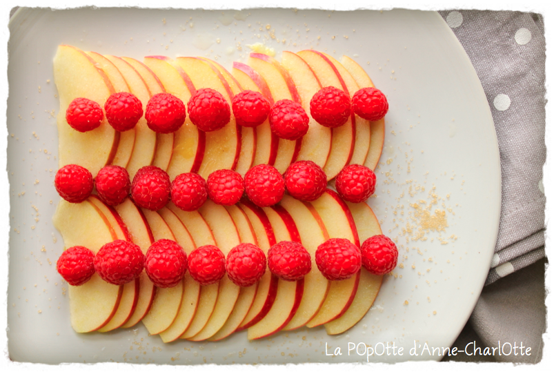 Ingrédients pour 2 personnes : - 1 belle pomme Pink Lady- 100g de framboises fraiches- 1 quartier de citron jaune bio - 1 c à soupe de cassonadeRincer la pomme. La couper en 4 puis enlever ses pépins en prenant soin de garder sa peau (qui renferme le plus de vitamines !). Couper les quartiers en fines lamelles et les disposer dans une grande assiette. Ajouter les framboises fraiches. Saupoudrer de cassonade et arroser de citron. L'Astuce de la POpOtte : Le citron permet aux pommes de ne pas noircir et cela donne une belle touche d'acidité.L'Accord Met/Vin de la POpOtte : un verre de cidre rosé !