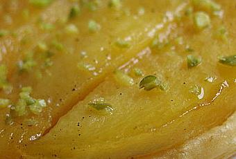 Pour 3 tatins, il vous faut : 1 mangue mûre à point, de la pâte feuilletée (moi la mienne vient de chez mon boulanger et çà n'a rien à voir !) 1/2 gousse de vanille, une noisette de beurre 1/2 sel, 1 cs de cassonade, quelques éclats de pistache non salées.